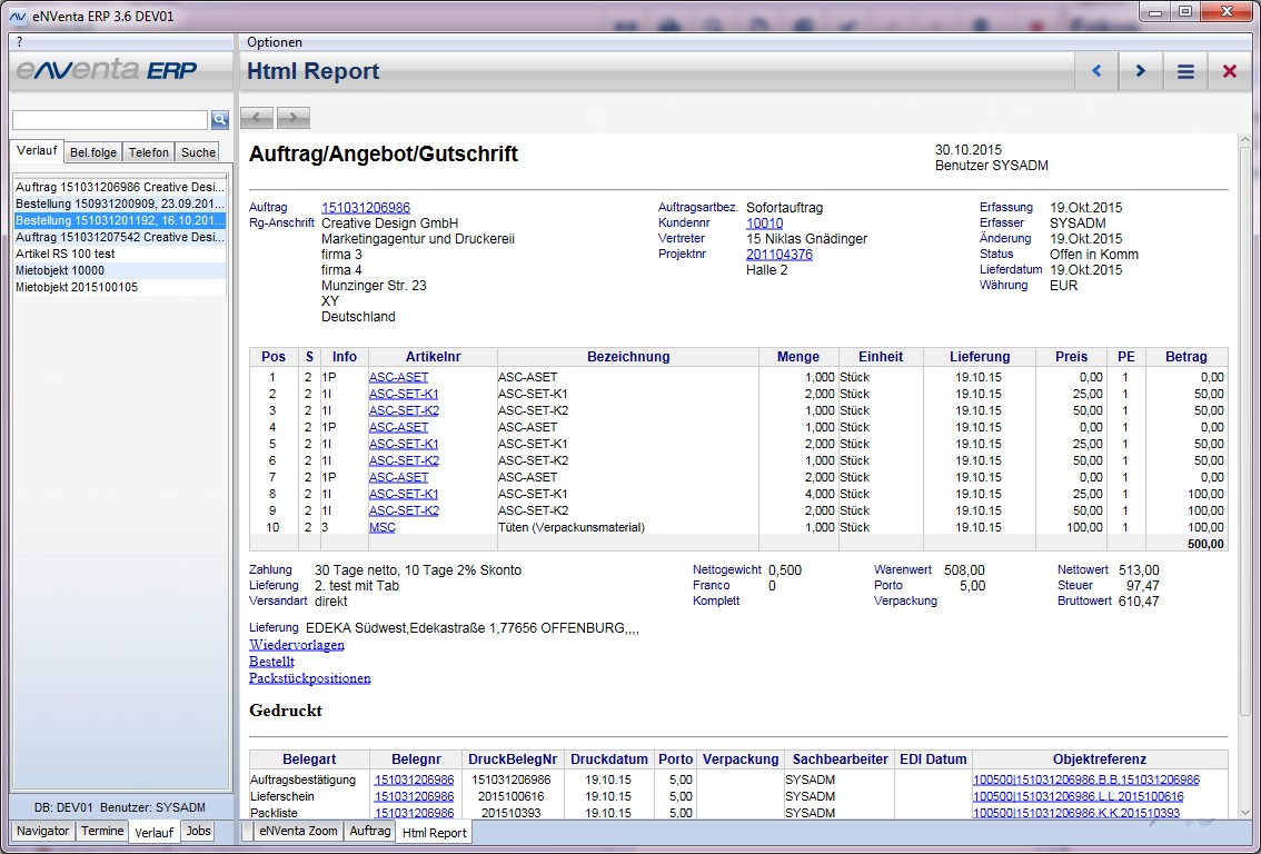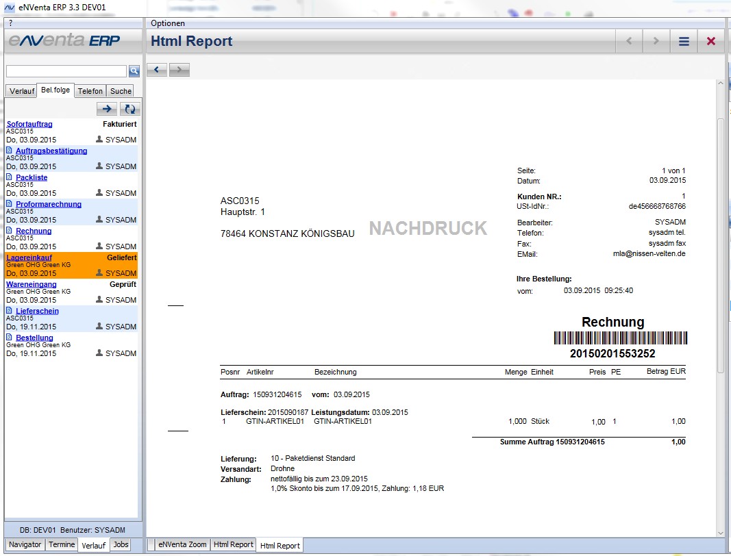 Ab Version 3.7 werden gedruckte Dokumente aus der Belegfolge (Verkauf, Einkauf und Produktion) direkt im Html Report Viewer angezeigt. Vorteil ist die direkte Anzeige des Inhalts des Reports anstatt einen Umweg über den Dialog Druckbelege zu gehen.